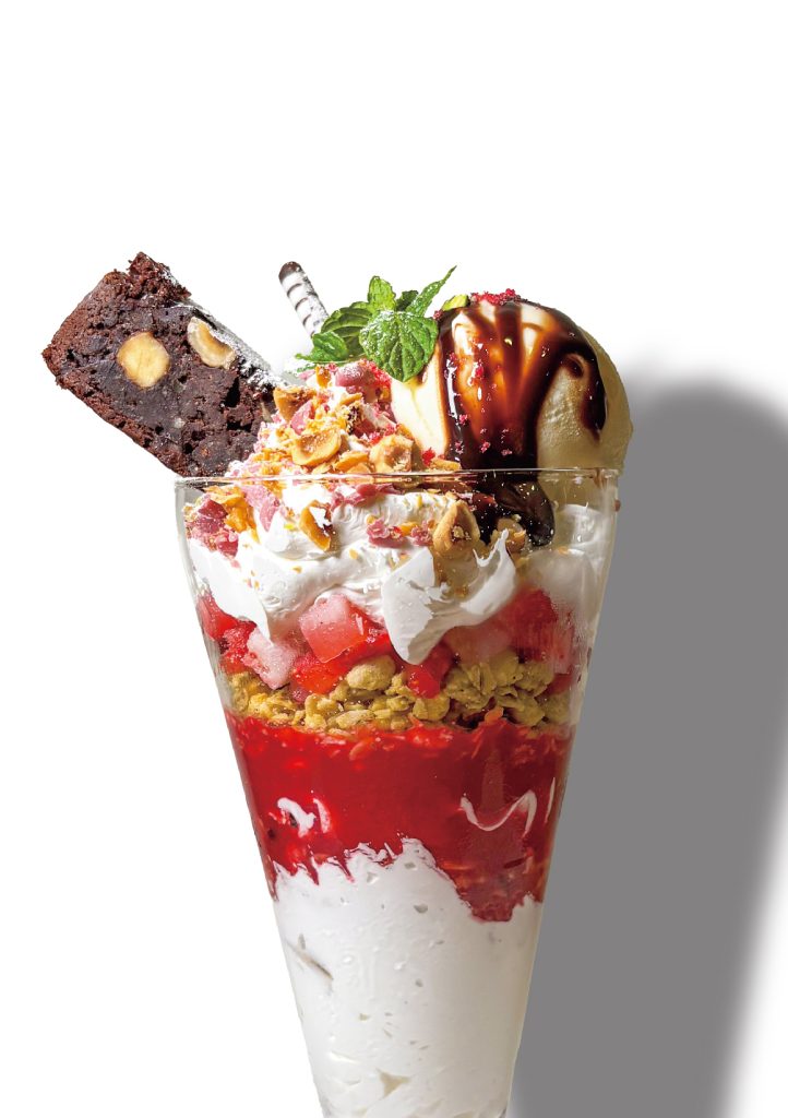 青山店では現在、夏季限定メニューを提供中。おすすめは「ショコラーデンベッヒャー」。バニラアイスにナッツやドライフルーツ、冷凍いちごなどを贅沢に盛り付けたチョコレート風味のパフェです。ちなみにドイツ語で「アイスベッヒャー」は、「アイスクリームカップ」のこと。本場ドイツやオーストリアでは夏になるとカフェテラスで、「アイスベッヒャー」を楽しむ人々の姿が!