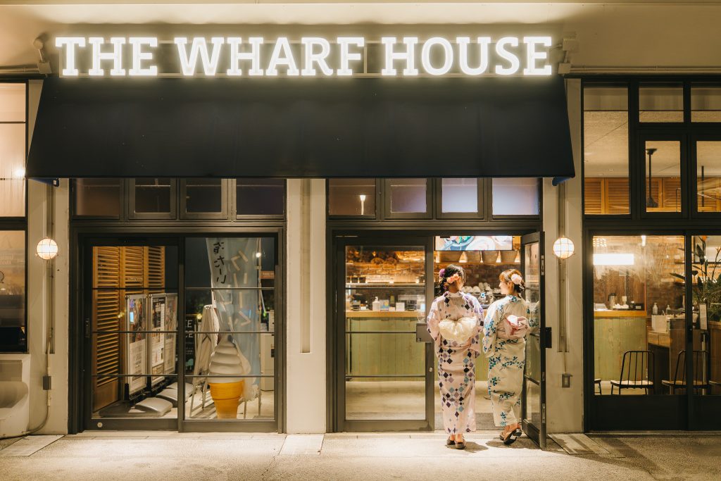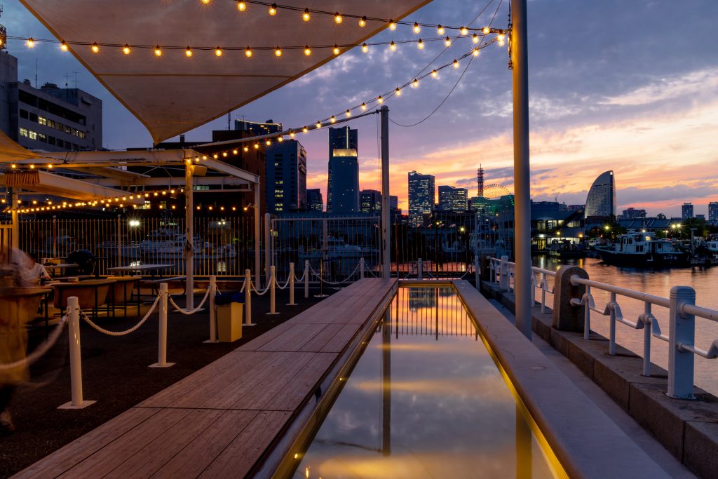 浴衣に着替えた後は、横浜の街を自由に散策するもよし。ディナーは「ザ・ワーフハウス山下公園」のテラス席で、横浜ベイブリッジや大さん橋、横浜港を望む美しい夜景を背景に、BBQプランまたはコース料理(2時間の飲み放題付き)を堪能できます。