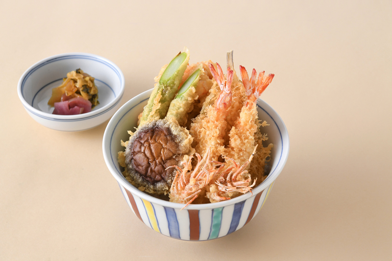 「松屋オリジナル天丼(お新香付)」は、松屋銀座でしか食べられない限定。才巻エビ2尾、キス、アスパラ、シイタケエビ詰め、小海老のかき揚げが入った豪華なオリジナル天丼です。もちろん国産の特別栽培米や、伝統の「天丼のつゆ」を使用。