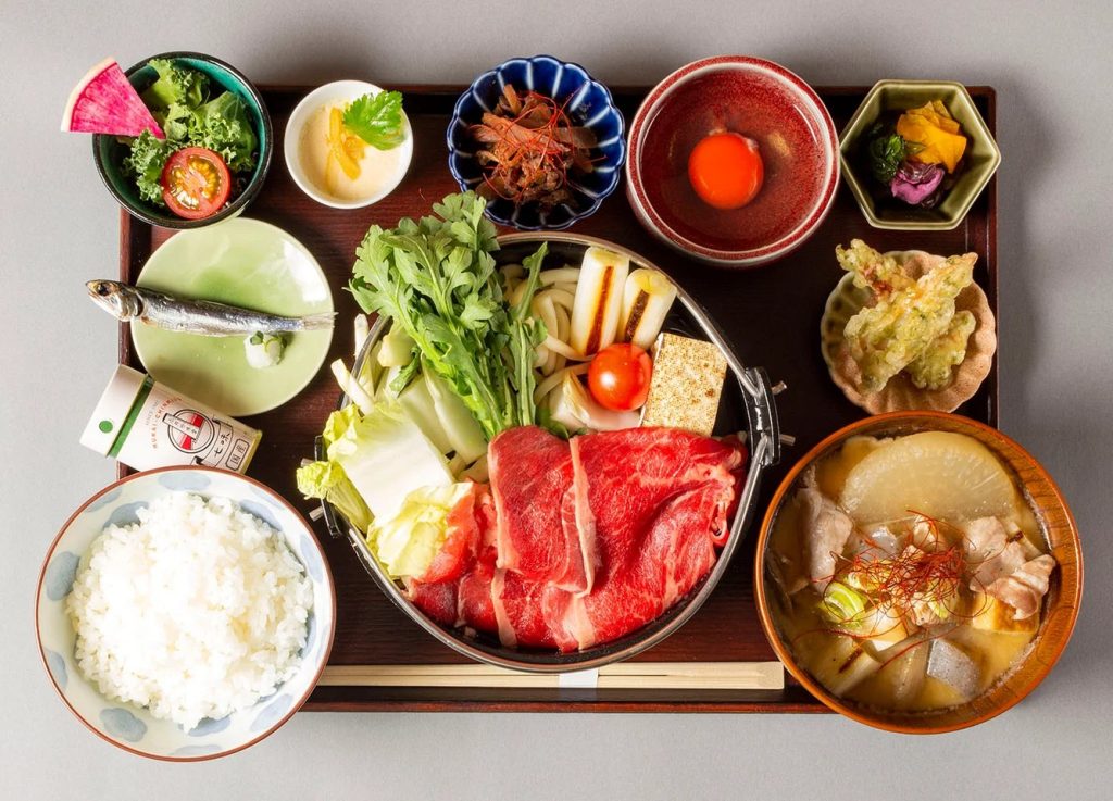 「贅沢牛すきやき御膳」(あおさ味噌汁セット2585円、八海山酒粕豚汁セット2970円共に税込)。