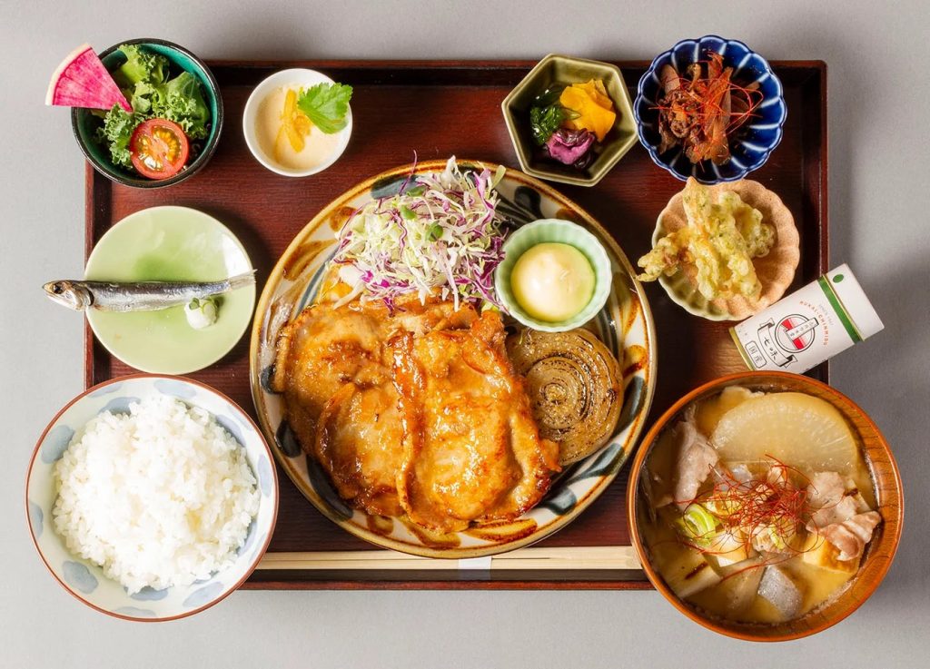 「豚ロース生姜焼き御膳」(あおさ味噌汁セット1760円、八海山酒粕豚汁セット2145円共に税込)。