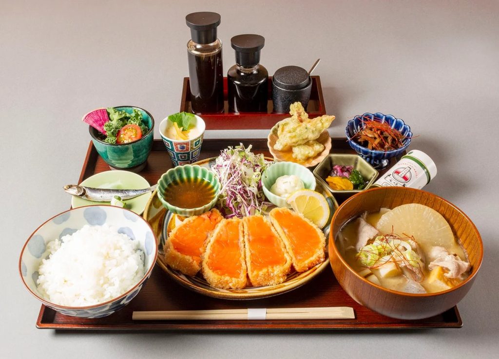 「サーモンのレアカツ御膳」(あおさ味噌汁セット2090円、八海山酒粕豚汁セット2475円共に税込)。