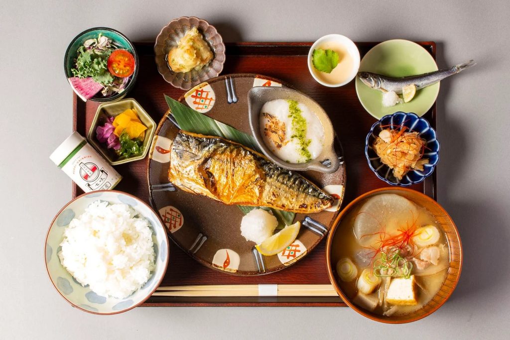 「焼塩鯖と出汁とろろ御膳」(あおさ味噌汁セット1980円、八海山酒粕豚汁セット2365円共に税込)。