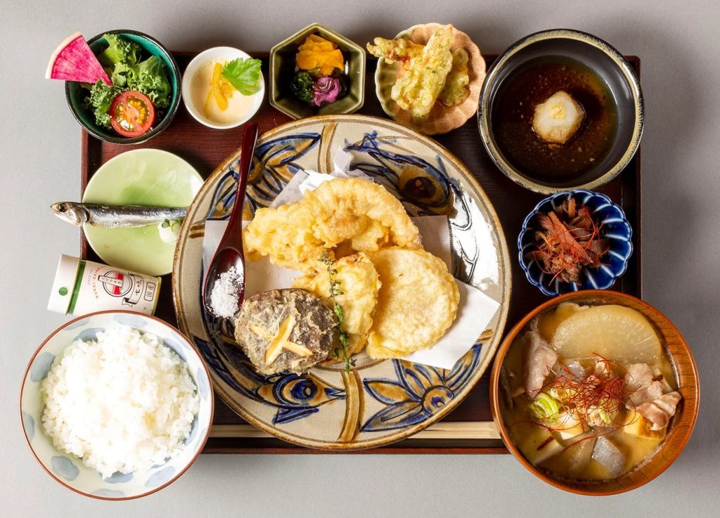 「天ぷら盛り合わせ御膳 (新潟県産肉厚椎茸・鶏天・豚天) 」(あおさ味噌汁セット1925円、八海山酒粕豚汁セット2310円共に税込)。