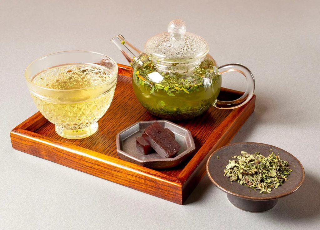 美味しい御膳を堪能した後に、日本茶も多数のメニューを用意。静岡県産無農薬茶葉の旨味と渋みの調和のとれた味わいの「深蒸し緑茶」、緑茶の茎を低温で炒り香りと旨味を合わせた味わいの「白樺茶 鬼の白骨」、清涼感のあるミントをブレンドしたさわやかな味わいの「薄荷煎茶」などを味わえます。さらに、「和紅茶」「レモングラス煎茶」などユニークなお茶も!