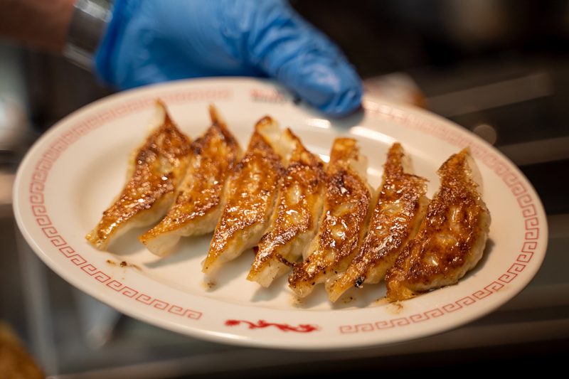自慢の餃子は、薄皮を使った一口野菜餃子。国産野菜の甘味の中にニンニク、しょうがの風味をしっかり感じられます。厳格な安全基準の下で生産された国産野菜を使用。つけだれは餃子の特製たれ、自家製ラー油、味噌、コショウ、酢、からしの6種類を用意。自分好みに混ぜて使うのが、よしこ風の餃子の楽しみ方!