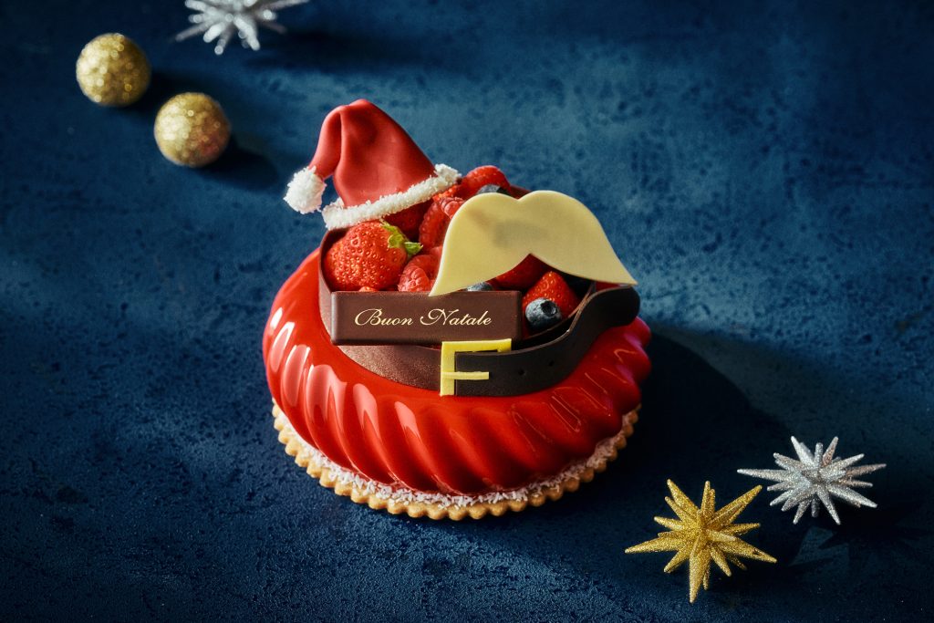さらに、サンタクロースを彷彿とさせる、帽子や白ひげ、ベルトが添えられた真っ赤なストロベリームースケーキ「サンタ ストロベリームース」も。香ばしいピスタチオのクリームや甘酸っぱいストロベリージュレがストロベリームースで包み込まれ、表面は真っ赤で艶やかなチョコレートでコーティング。トップにはフレッシュないちご、ラズベリー、ブルーベリーがたっぷりとあしらわれ、さらにサンタクロースの帽子と白いひげ、ベルトをかたどったチョコレートが添えられています。遊び心のあるデザインでありながら、香り高いピスタチオの風味とベリーの爽やかな酸味のバランスが絶妙な洗練された味わいです。