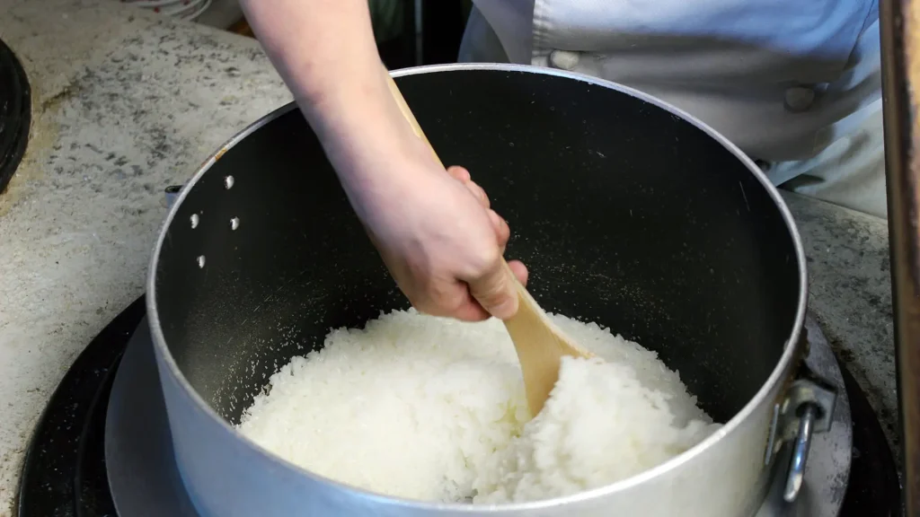 ご膳メニューを注文すると、大かまどご飯、味噌汁、キャベツ、お漬物が全部おかわり無料の食べ放題。店内の大きな釜で炊き上げられる大かまどご飯は、新潟県産コシヒカリ、十穀米、そして月替わりの炊き込みご飯の3種類から選べます。