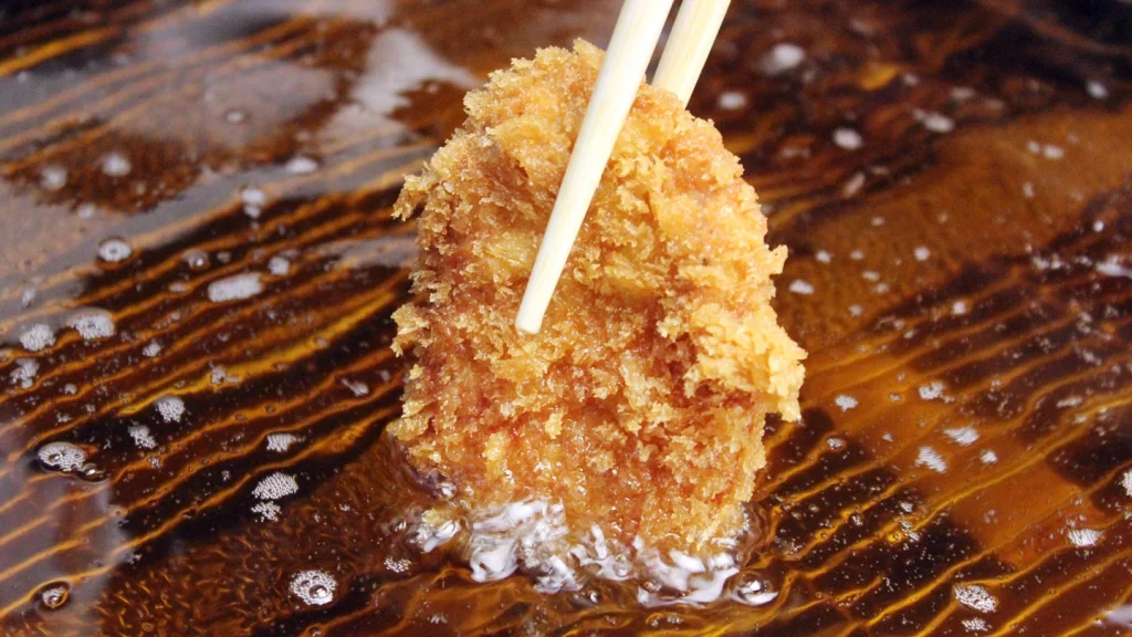 この「よし平」の魅力は、徹底したこだわりが生み出す他にはない丁寧な調理。豚肉を一度熟成させることで、肉本来の旨みが増して、驚くほどの柔らかさに。さらに、注文を受けてから一枚ずつ丁寧に生パン粉で包み、特製の「米油」でじっくりと低温で揚げます。これにより、衣はふんわりサクサク、厚切りなのに驚くほど柔らかに。超ジューシーなとんかつが完成。