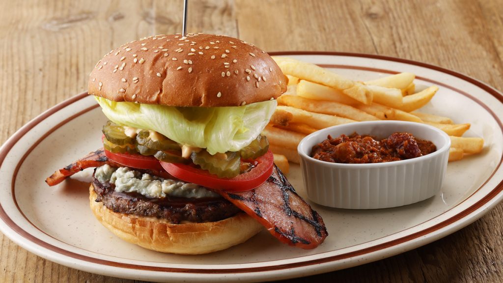 「セントルイス ブルースバーガー」は、ブルーチーズ好きにはたまらないハンバーガー。ビーフ100%のパティに、シャープな塩味とコク深い味わいが特徴の「ロックフォール」というブルーチーズをサンド!