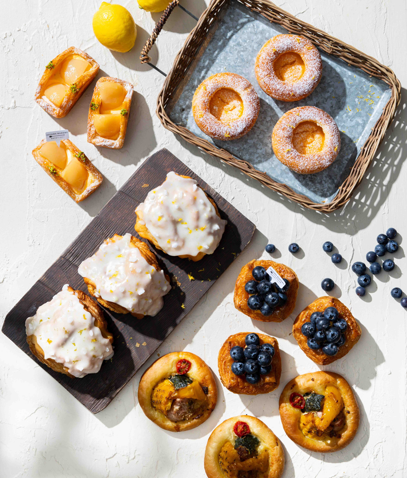 季節のパンも提供。季節ごとの味覚を楽しめる「季節野菜のフォカッチャ」(480円)、「白桃デニッシュ」(380円)、「レモンクリームパン」(390円)、「クロワッサン シトロン」(480円)などを用意。定番の「食パン」(350円)や「バターロール」(220円)、「イングリッシュマフィン」(3個入り340円)、「バゲット トラディション」(380円全て税込)など毎日食べても飽きない定番パンも勢揃い!