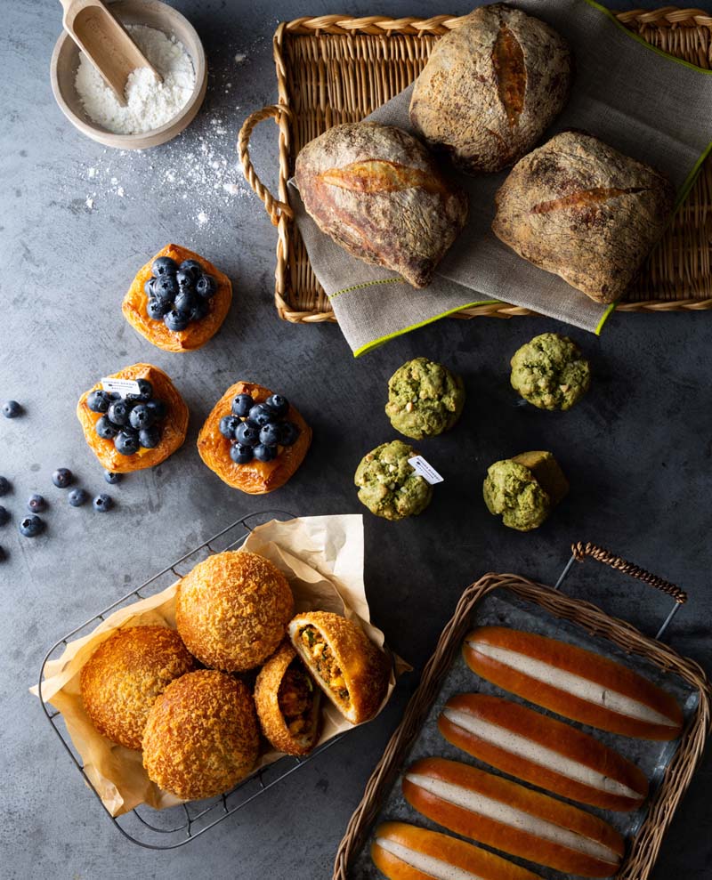 ここでしか味わえない、埼玉県産の食材をふんだんに使った地産地消のパンをぜひ! 埼玉県産ほうれん草を練り込んだ「カレーパン」(380円)、外はカリッと中はモチモチ食感の「埼玉県産小麦ハナマンテンのリュスティック」(230円)、芳醇な香りが広がる「狭山茶のスコーン」(260円)、大豆の香ばしさが特徴の「大豆コーヒーのミルクフランス」(330円)など、地元の恵みを生かしたラインアップ。埼玉県産ブルーベリーを贅沢に使った「埼玉県産ブルーベリーデニッシュ」(420円全て税込)もおすすめ!