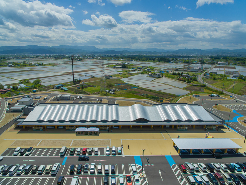 大きな波形の屋根が特徴的な「道の駅国見あつかしの郷」。