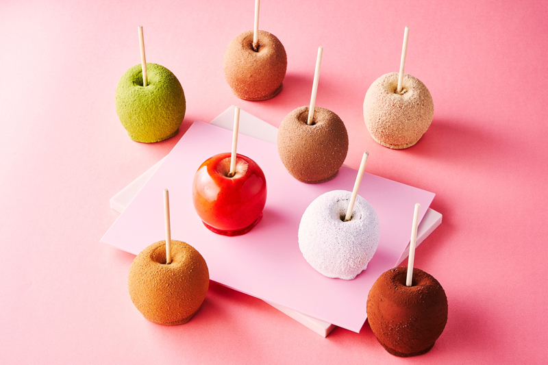 りんご飴の種類はいろいろ。一番スタンダードなのが、「Premium Plain(プレミアプレーン)」(680円)。他にも「Yogur Choco(ヨーグルチョコ)」(680円)、「Cinnamon Sugar(シナモンシュガー)」(790円)、「Pure Cocoa(ピュアココア)」(790円)、「Tanba Kuromame Kinaco(丹波黒豆きなこ)」(790円)、「Uji Matcha(宇治抹茶)」(790円)、「Tea(紅茶)」(790円全て税込)。