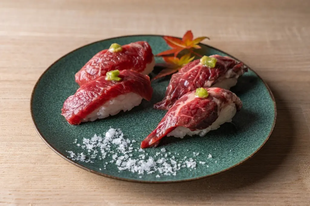 他にも鴨肉と馬肉のサイドメニューも充実。例えば「馬水餃子〜ブルーチーズソース〜」や「鴨もも肉の西京焼き」など、食べたことないメニューが勢揃い。〆には「赤身と霜降りの馬肉握り4貫」をぜひ。