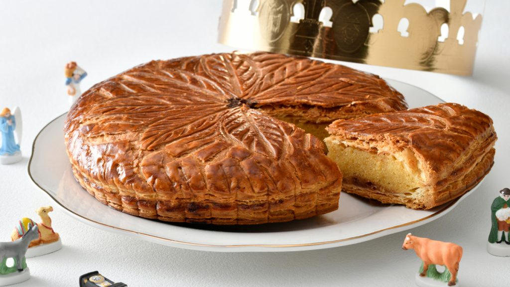 バターの香るサクサクのパイ生地の中に、風味豊かな優しい甘さのアーモンドクリームをたっぷりと包み込んだスイーツ。パイ生地の表面には、伝統的な飾り模様(レイエ)…「勝利」を意味する月桂樹の葉の模様が描かれています。