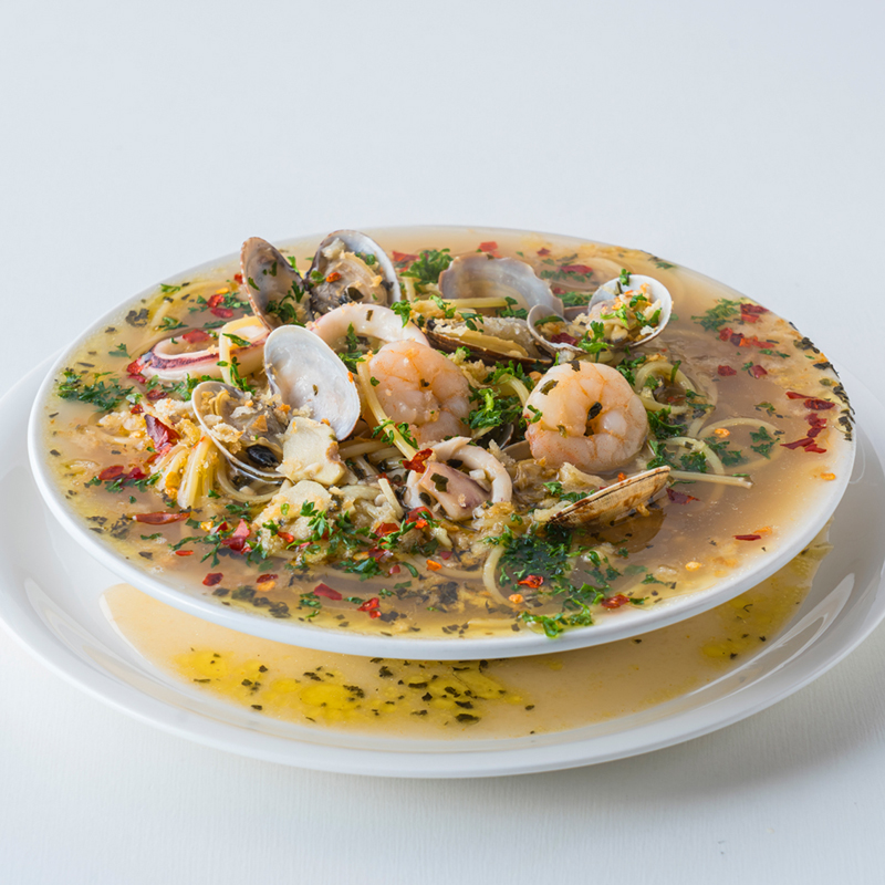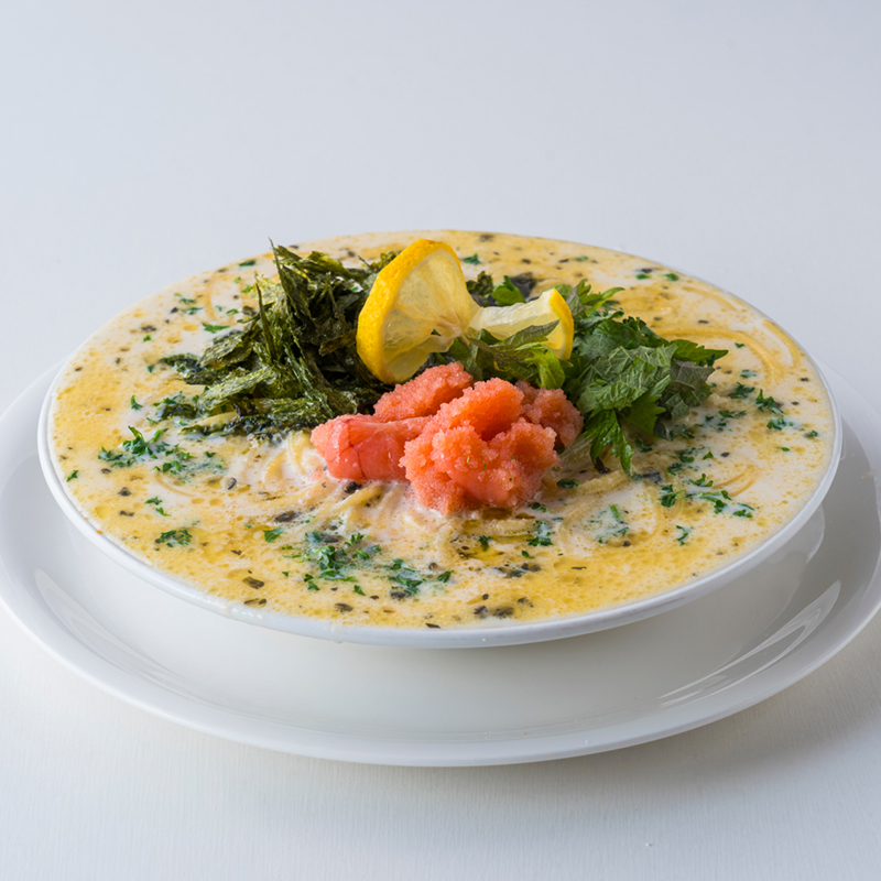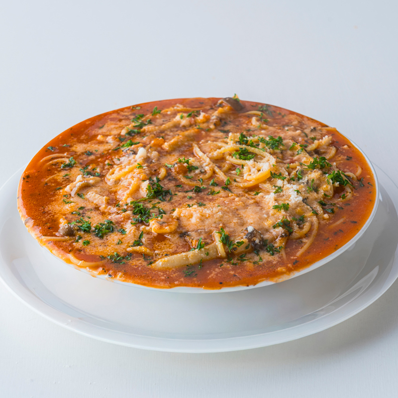 リニューアルしたスープパスタは、素材や味のバランス、調理法を見直し。「スープを飲み干したくなる一皿」がコンセプトに、濃厚さと満足感を徹底的に追求した一品に。10種以上の香味野菜とスパイスをスープに使っているのも、こだわりの1つ。旨味、コク、キレのバランスが取れ、濃厚ながらも後味に重さを残さない味わい。なお、ミートソースやクリームソースは厨房で丁寧に仕込み、具材感たっぷりで奥行きのある味わいを実現。そして、表面に微細な凹凸が生まれるブロンズダイスという製法の麺を採用し、スープとの絡みを抜群に!