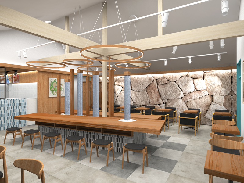 ドトールコーヒーショップとオリンピック記念宿舎とのコラボレーションを実現したカフェの内観も注目。例えば店内の壁面には、「花崗岩のダイヤモンド」と称される庵治石(あじいし)を敷き詰め、自然との調和を演出。さらに、店内中央に配置した一枚板の大テーブルには、ケヤキの無垢材を使用。耐久性に優れ美しい木目が特徴のケヤキは、オリンピックの歴史を感じながらカフェの空間に豊かな風合いをもたらしています。