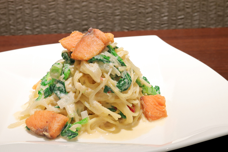 メインディッシュ「阿武隈川メイプルサーモンクリームスパゲティー」(2500円税込、メインディッシュとビュッフェ、デザートを含む)。