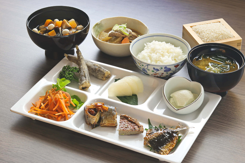 米麹と塩、蒸し米を3:5:8の割合で混ぜた伝統的な漬け床「三五八漬け(さごはちづけ)」、会津天宝謹製の味噌漬け、目黒麹店の「会津田舎味噌」を使用した味噌汁も味わえます。その他にも、会津の郷土料理「こづゆ」や、いわきの「さんまポーポー焼き」、シャキシャキとした食感の「いかにんじん」など、福島県の食文化を存分に味わえるメニューを揃えています。