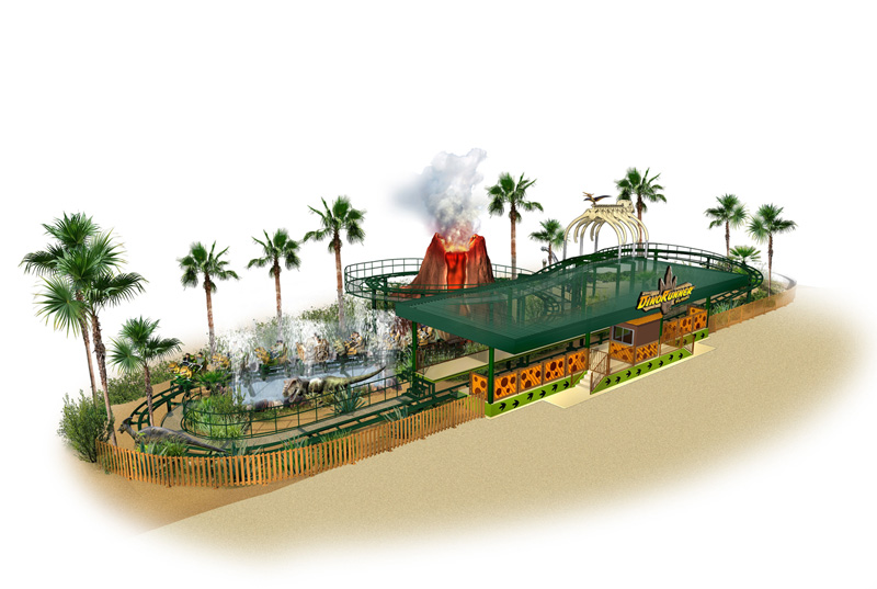 8両編成のコースター「ディノランナー」は太古の世界を感じる森の中、巨大な骨のトンネルを抜け、ダイナミックな火山を見ながら疾走。