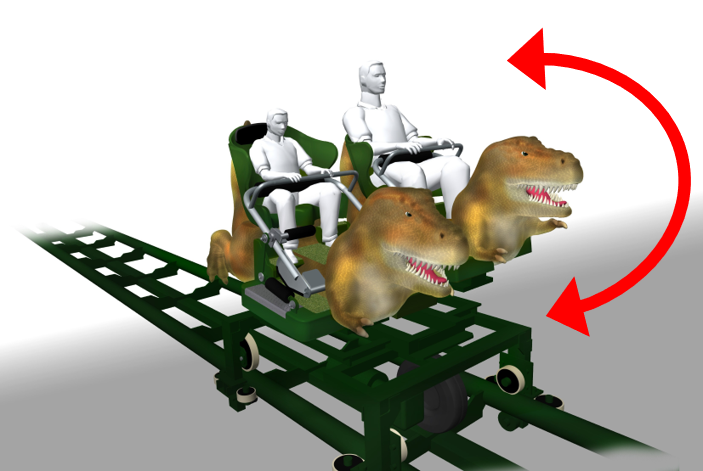 「ディノランナー」は、1週136mを巡る8両編成のコースター。ティラノサウルス、トリケラトプスの恐竜車両6両とトロッコ2両が連なっています。恐竜車両は走行に合わせて前後や上下に揺れ、まるで恐竜の背中に乗っているよう。