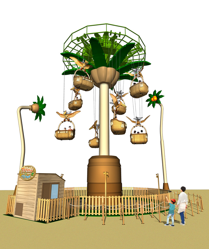 「プテラノドンとお空の大冒険」は、プテラノドンが掴むカゴに乗って高さ約10mの空中散歩を楽しむタワー型アトラクション。手元のレバーを操作すると、カゴが上へ下へ移動。外周の木の実に高さを合わせて木の実を獲得できるミニゲームも楽しめます。