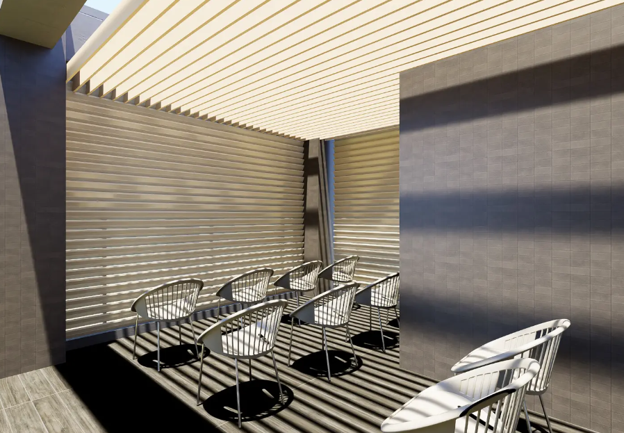 サウナ後は熱った身体を、爽やかな風で優しく癒してくれる「外気浴スペース」。
