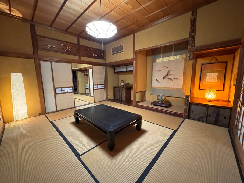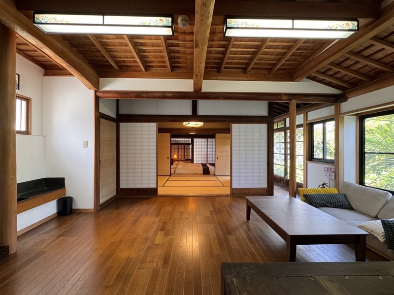 この施設の魅力はもちろん、歴史的建造物での宿泊体験。「奥座敷」と「離れ」にそれぞれ1組ずつ、最大12名が宿泊でき、いずれも建物が積み上げてきた歴史と雰囲気を体感。特に「離れ」は、戦前に衆議院議員を務めていた当主の時代に建てられた、迎賓館を兼ねた建造物。障子の組子や欄間などの随所に細工を施しており、その歴史に宿泊体験で触れられます。