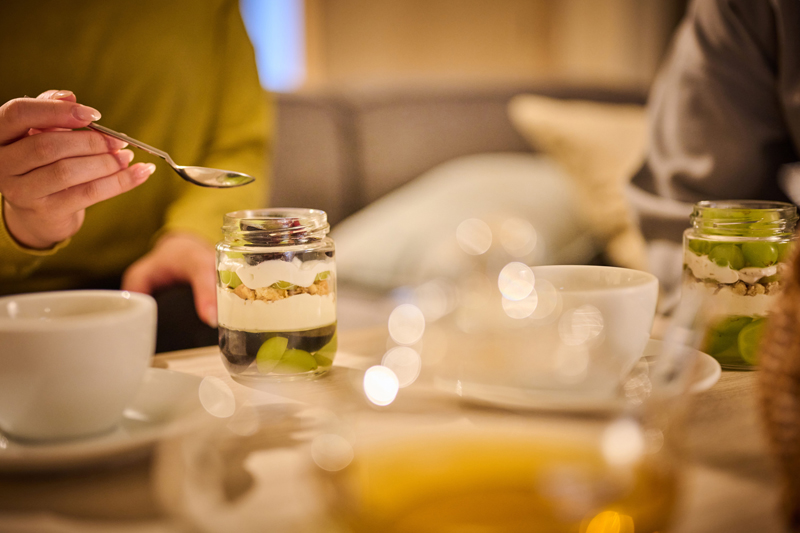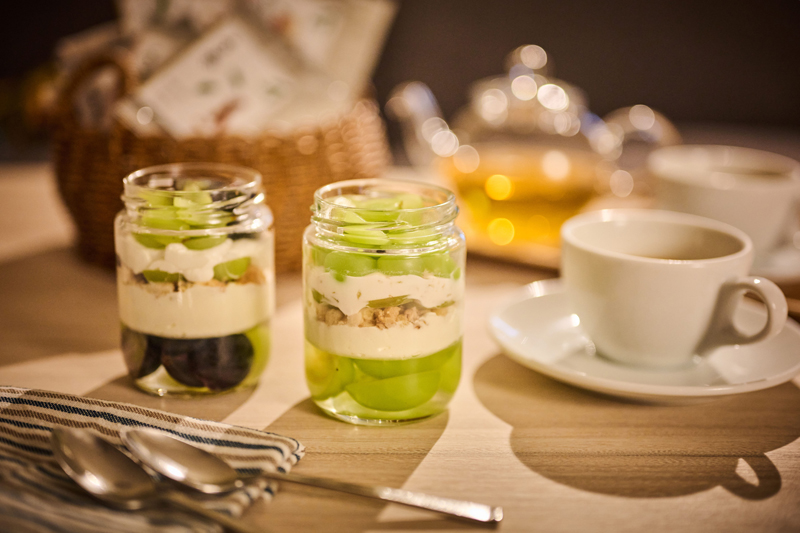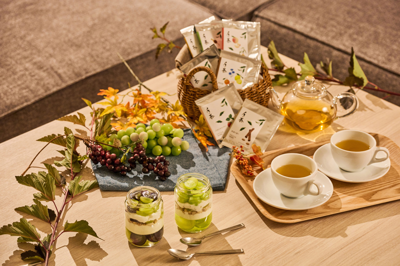 チェックイン後に、旬を迎えたぶどうを贅沢に使った特製「ぶどうパフェ」と、那須産の香り高い紅茶を提供。巨峰やマスカットの瑞々しさと、紅茶の上品な香りが調和する至福のひと時を楽しめます。