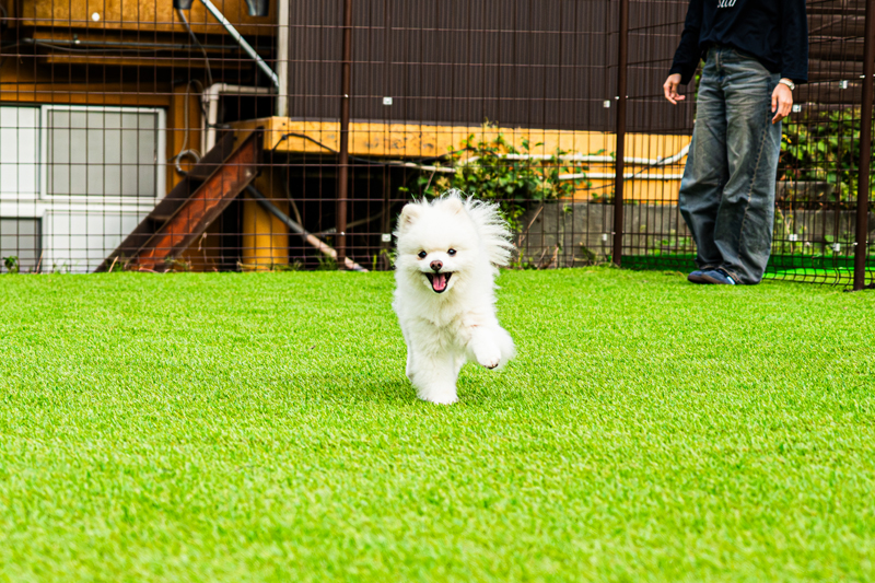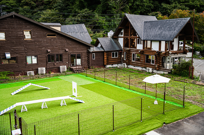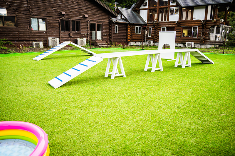 もちろんドッグランの設備も充実。小型犬エリアと大型犬エリアの2区画で構成し、総面積は約200㎡。地面には、犬の足に優しい20mm厚の人工芝を採用。さらに、遊具3基に加えてワンちゃん用プールも完備。愛犬が喜ぶこと間違いなし!