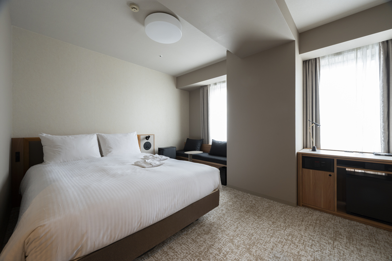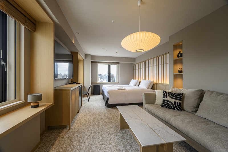 客室はオーク材を基調とした北欧テイスト。和紙を取り入れた壁紙やアート、黒のチェアを配し、和と北欧がバランスよく調和。全ての客室のベッドボードにはコンセントやUSBポートを設置し、利便性を向上。これまで設置していたデスクは撤去し、デンマーク製のソファーやベンチを配置。より広く快適に過ごせるよう配慮。