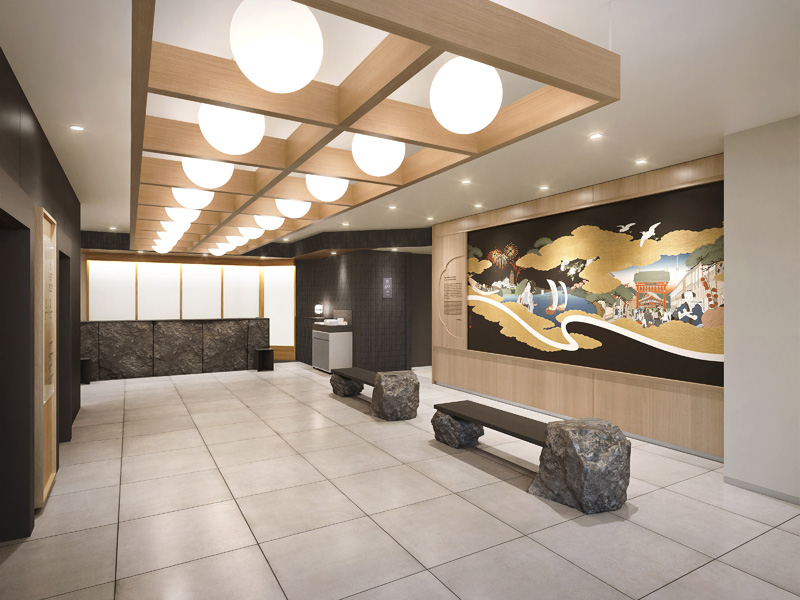 江戸の風合いと現代が交差する1階ロビー。