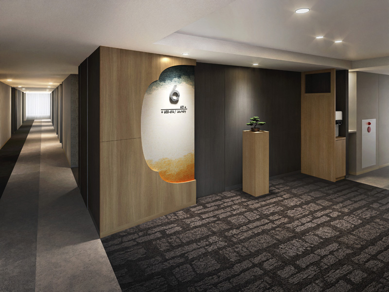 各階のエレベーターホールの床には、石畳を想起させるカーペットを敷いて、和テイストに。