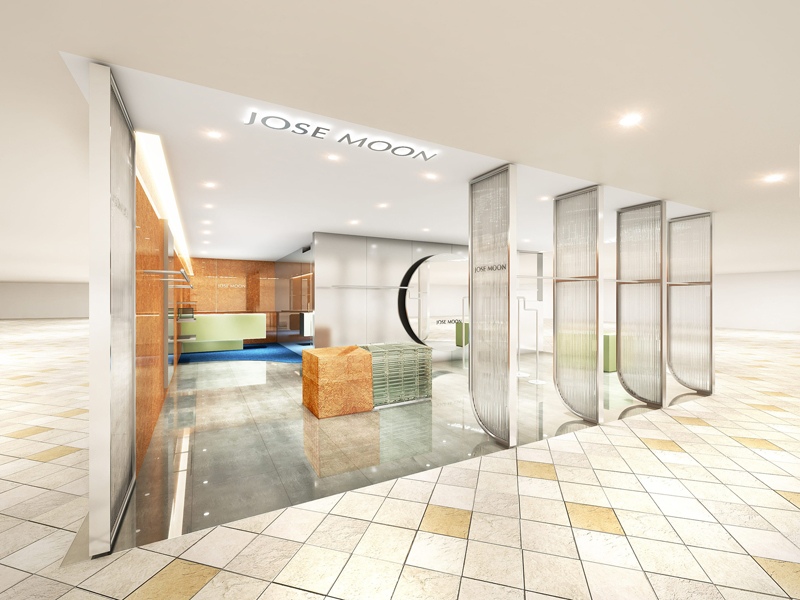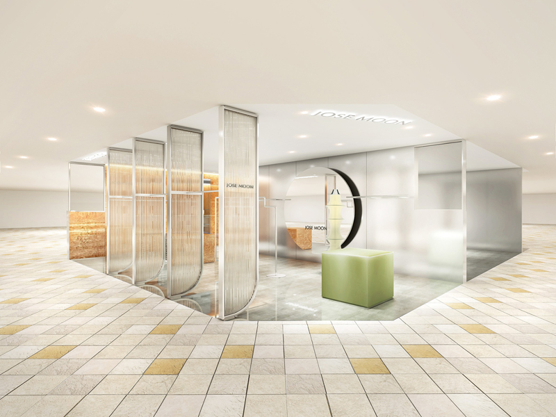「JOSE MOON」は、スタンダードなアイテムにモードなエッジを加え、遊び心ある自由なスタイリングを提案するファッションブランド。JR新宿駅に直結する「ルミネ新宿ルミネ2」にある店舗「新宿ルミネ2店」が今回リニューアル。ガラスやメタルの硬質感と異素材の対比を際立たせた空間デザインを採用。ステンレスやミラー、ガラス、樹脂コーティングのタイルを基調とし、シンプルでありながら自由でエッジの効いた空間に仕上げています。さらに、店舗奥の壁面には、抽象画を想起させる柄をガラスで包み込み、空間に奥行きと印象的なアクセントを添えています。