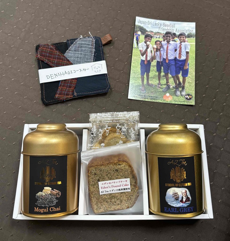 プレミアム紅茶50g茶葉×2種、エデンのパウンドケーキ1個、チャイティークッキー1袋、Denihagiコースター1枚、スリランカ野球応援ポストカード4種類のうち1種