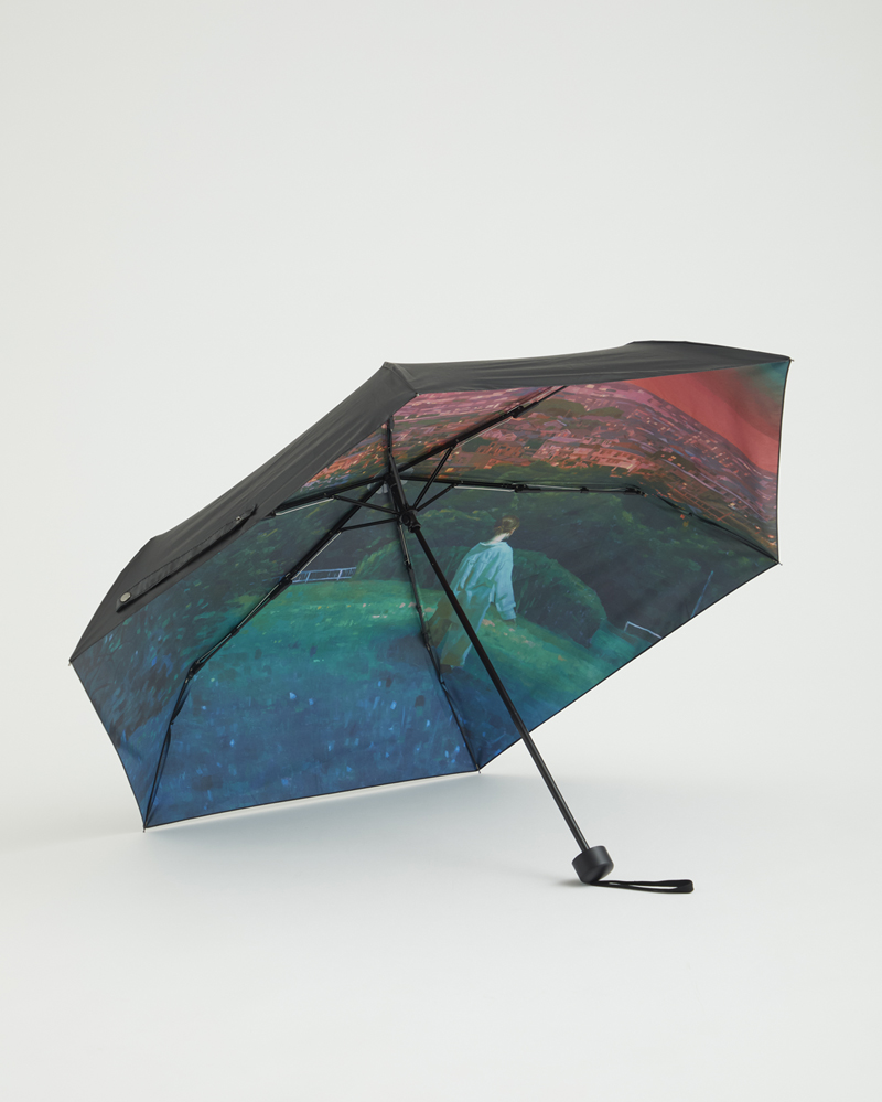 「折り畳み傘」は、傘の内側に作品を大胆にプリント。傘袋にも同様のデザインを施し、雨の日もアートを楽しめるアイテム。