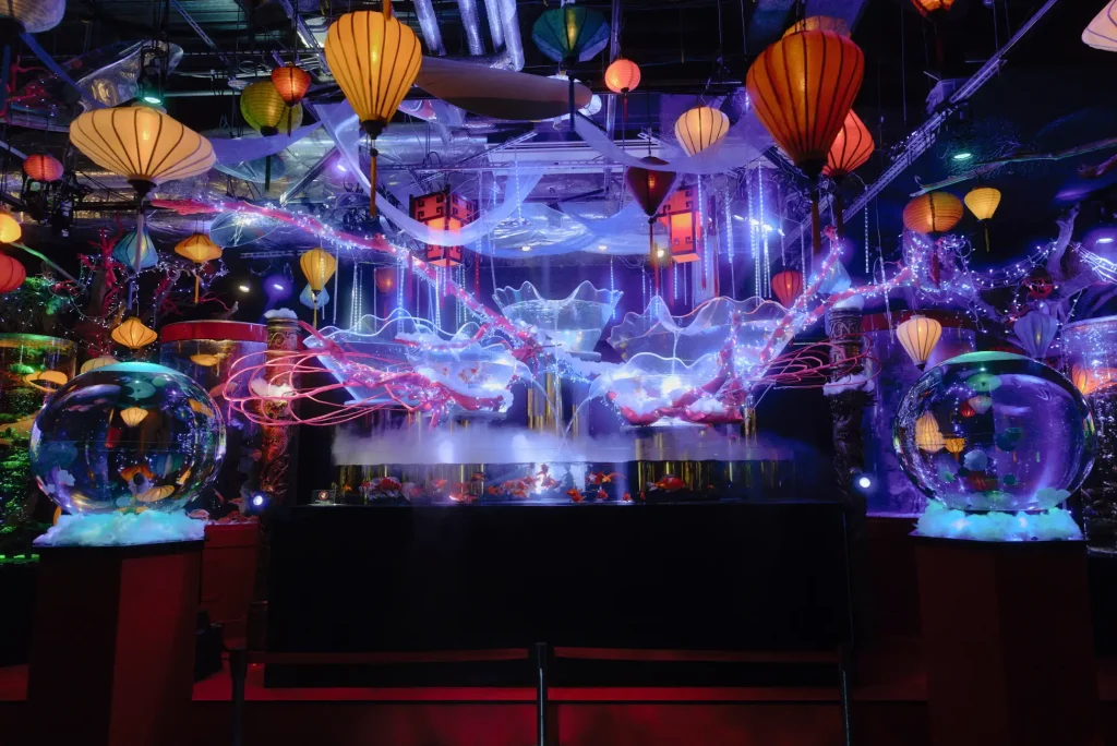 会場は5つのエリアに仕切られ、その中に広がる日本の冬の情緒も見どころ。エリア2の「花魁(おいらん)」では、周囲の装飾から水槽内まで白い花材で統一。柔らかな光が作り出す、息をのむような冬ならではの静かな美しさを演出。エリア4の「遊楽」は、松の装飾や冬柄の花札がモチーフ。和の伝統美と現代的なライティングが重なり、独創的な景色が広がります。
