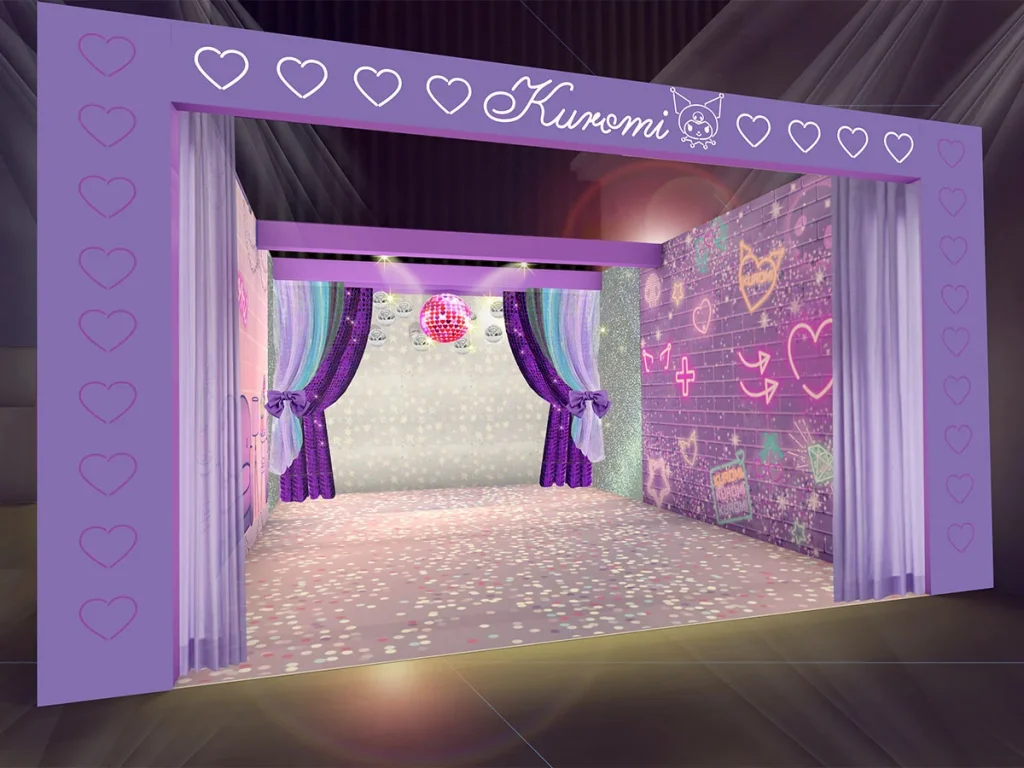 撮影部屋となる「推し色キャラルーム」は、どの部屋も趣向を凝らしており、イメージカラーの紫に輝く「キラキラ★クロミルーム」や、 巨大広告風のウォールなど多彩なフォトスポットを配置。