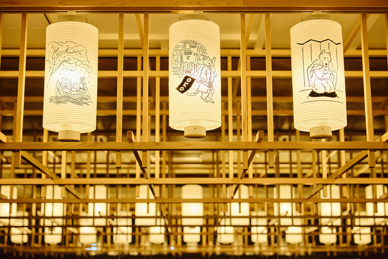 そんなOMO3浅草 by 星野リゾートでは、宿泊者向けに浅草の夜景を堪能するプロジェクションマッピング「あさくさ宵見世」を通年上映。壁一面を使ったプロジェクションマッピングで、窓に映し出される映像と、窓の向こうに見える幻想的な浅草寺の夜景が融合。上映する場所の頭上には提灯がずらりと並び、夜の参道の雰囲気も演出。